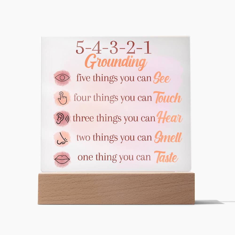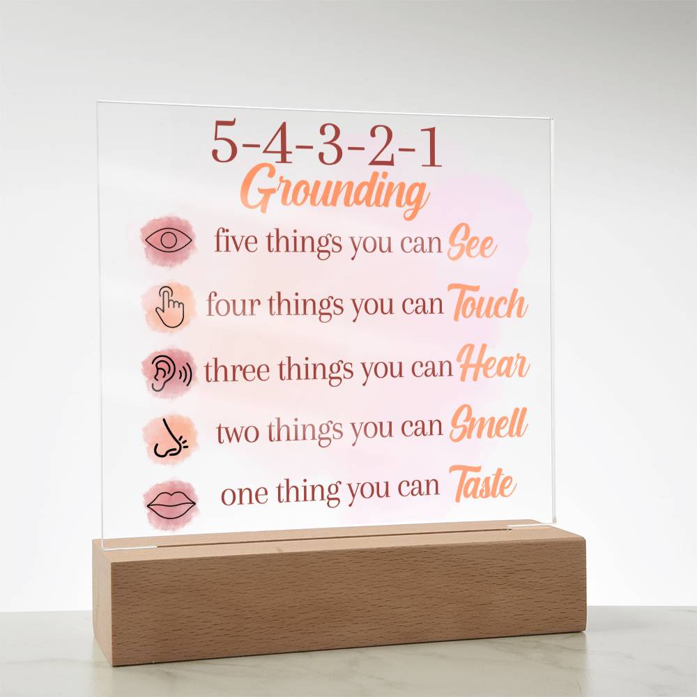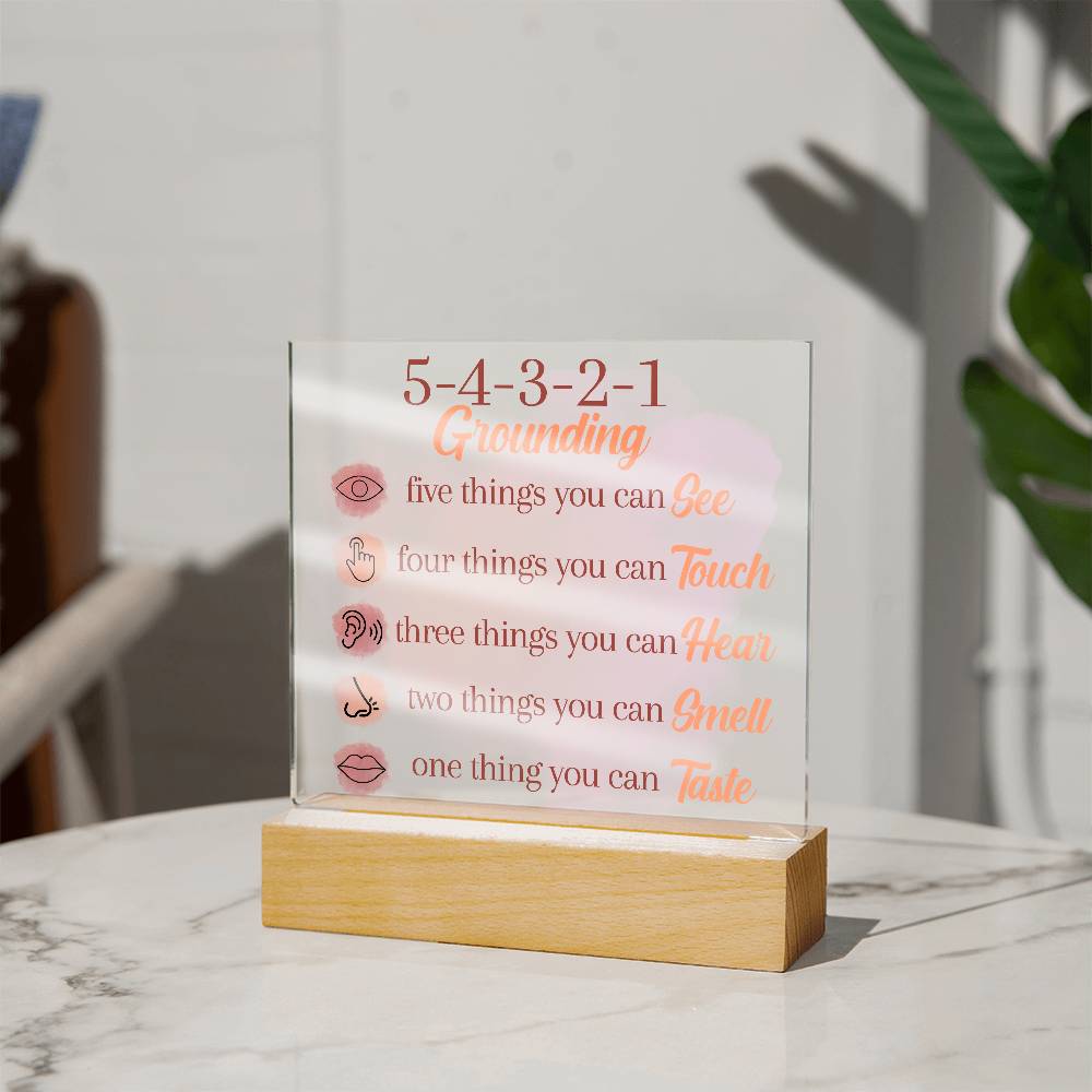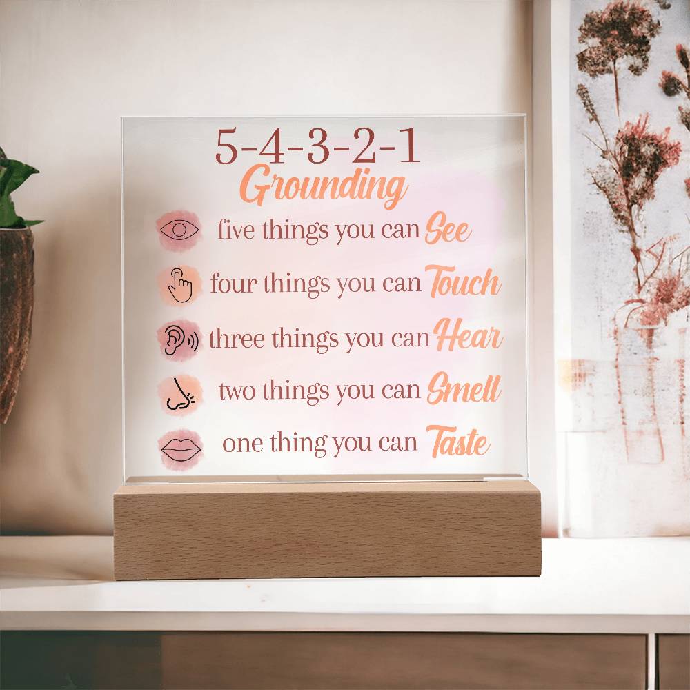 Our popular 5-4-3-2-1 Grounding Technique Square Acrylic Plaque!This design is printed on crystal-clear premium acrylic and look bright in natural light. This lush and attractive contemporary design comes with a sleek wooden base.