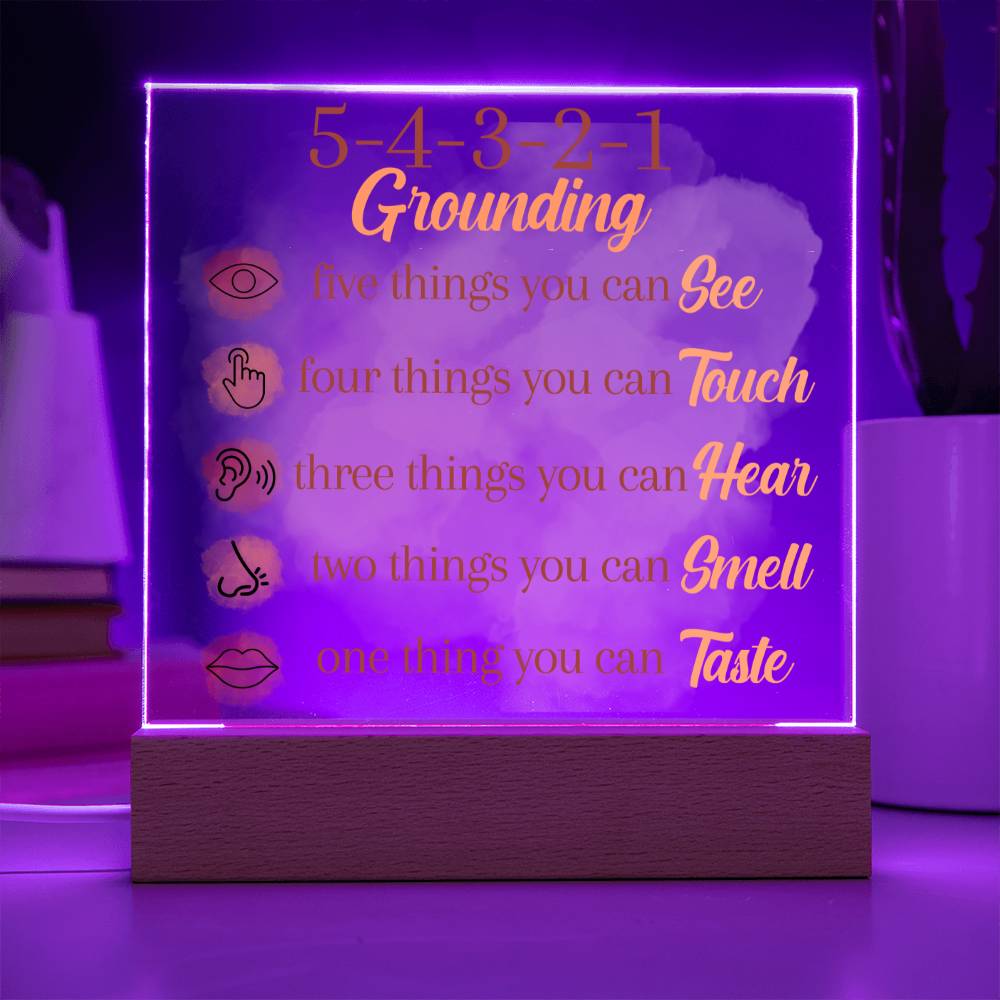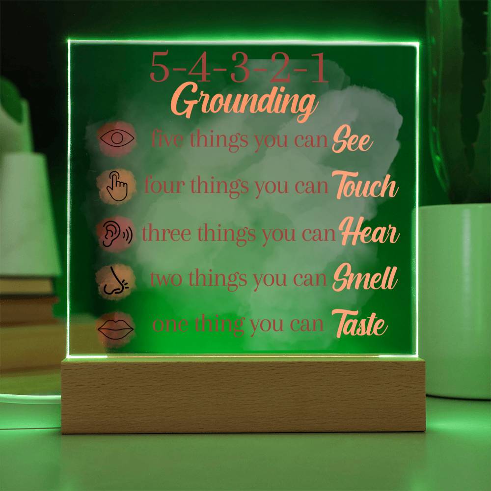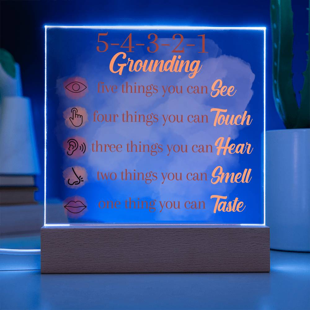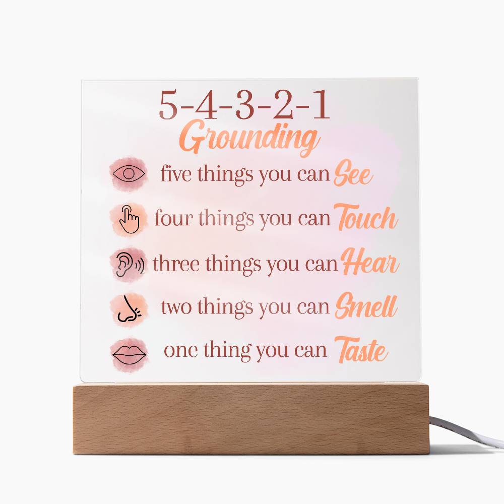 Our popular 5-4-3-2-1 Grounding Technique Square Acrylic Plaque!This design is printed on crystal-clear premium acrylic and look bright in natural light. This lush and attractive contemporary design comes with a sleek wooden base.