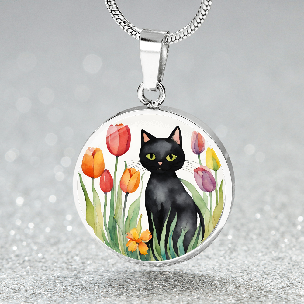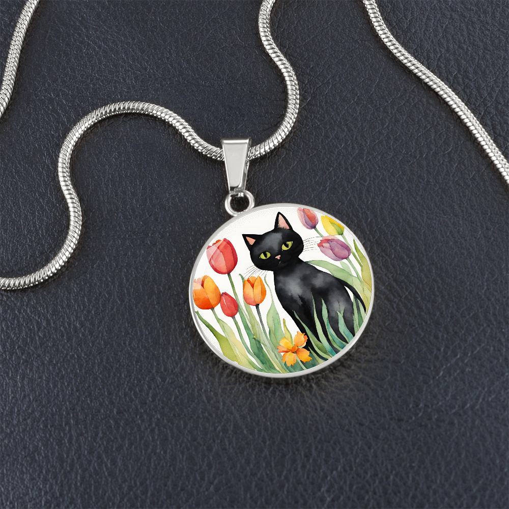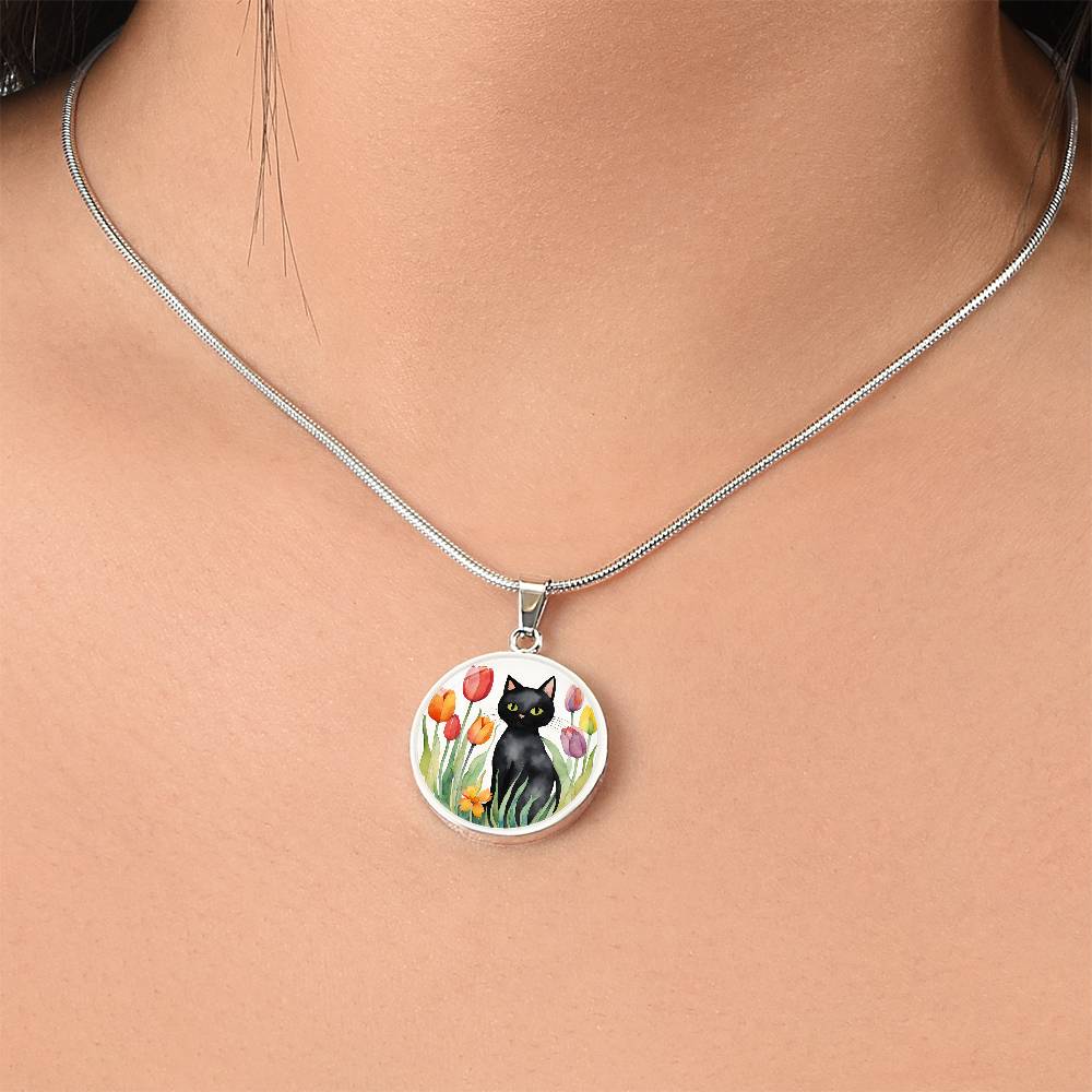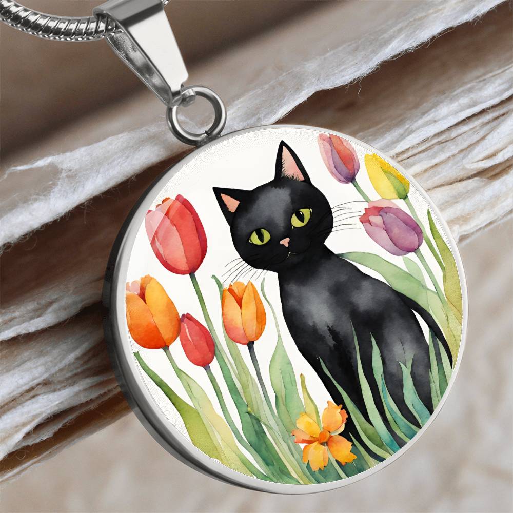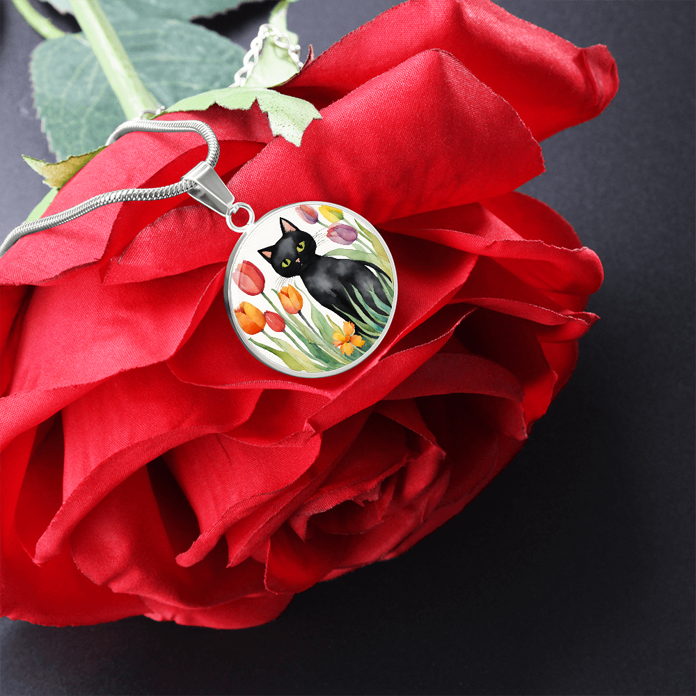 Vintage Black Cat Necklace | Cat Lover Gift | Quirky Cat Jewelry | Cat with Flowers Jewelry | Watercolor Look Necklace