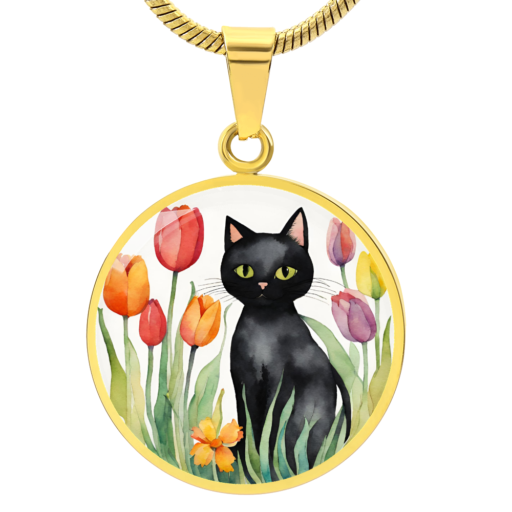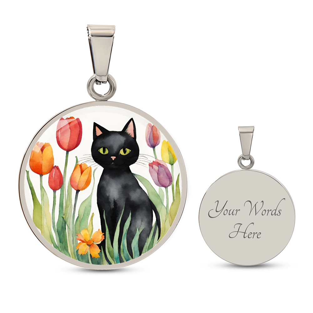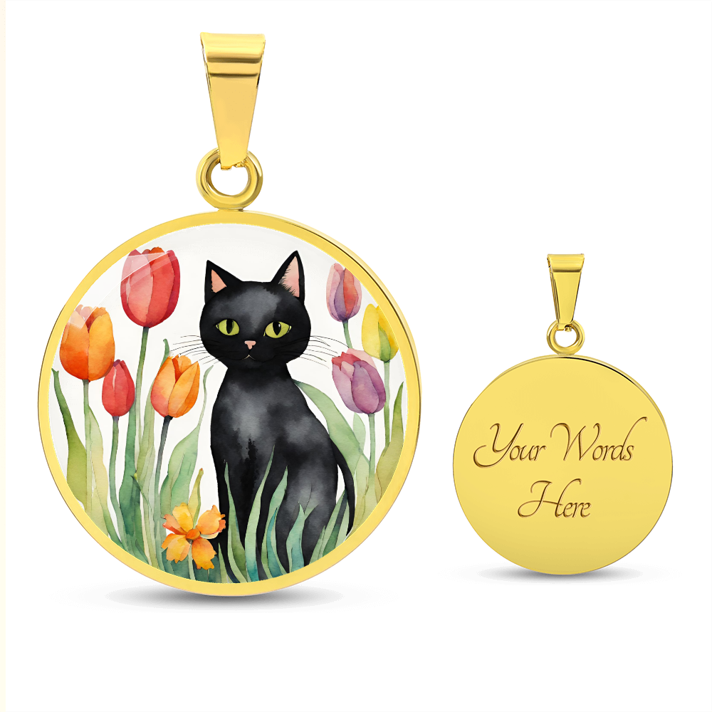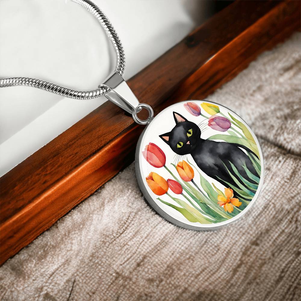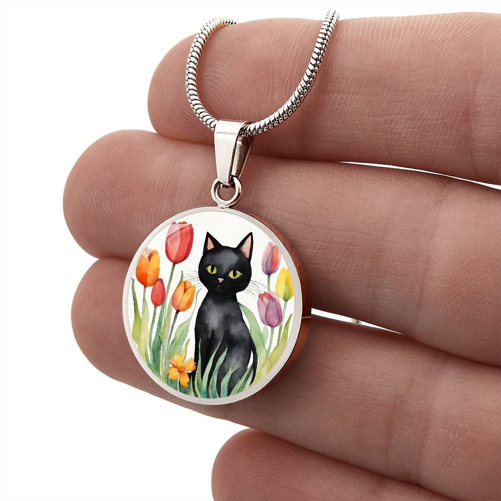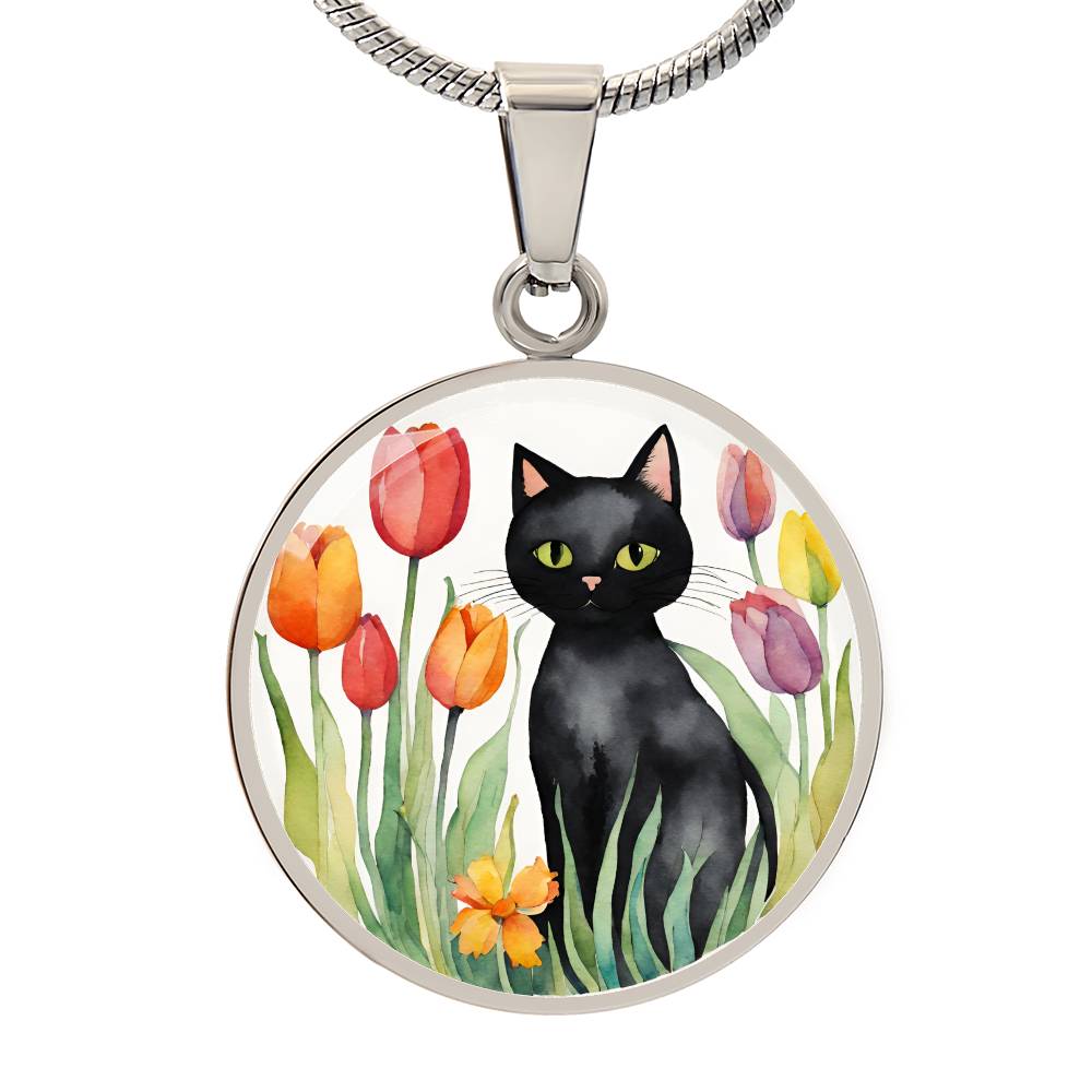 Vintage Black Cat Necklace | Cat Lover Gift | Quirky Cat Jewelry | Cat with Flowers Jewelry | Watercolor Look Necklace